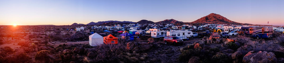 Die erste Nacht verbringen wir auf einem Parkplatz an einer kleinen Strasse kurz vor dem Ende der geteerten Straße und dem Einstieg in die Wüste. Am nächsten Tag erreichen wir dann die 24HourTown mitten im Nirgendwo. 1800 Teilnehmer + Supporter haben sich zusammen gefunden und errichten für ein Wochenende eine kleine, cyclophile, verrückte und sehr freundliche Community. Pivot Cycles ist vor Ort und unterstützt uns netterweise mit Demobikes, damit wir die Strecke abfahren können: Wow! Was für Trails. 16 Meilen durch die von Kakteen gespickte Wüste mit dem Rockface Drop zum krönenden Abschluss.