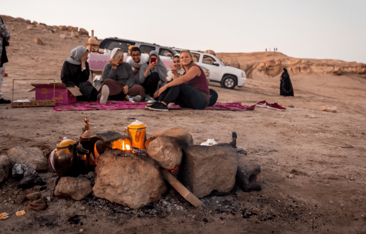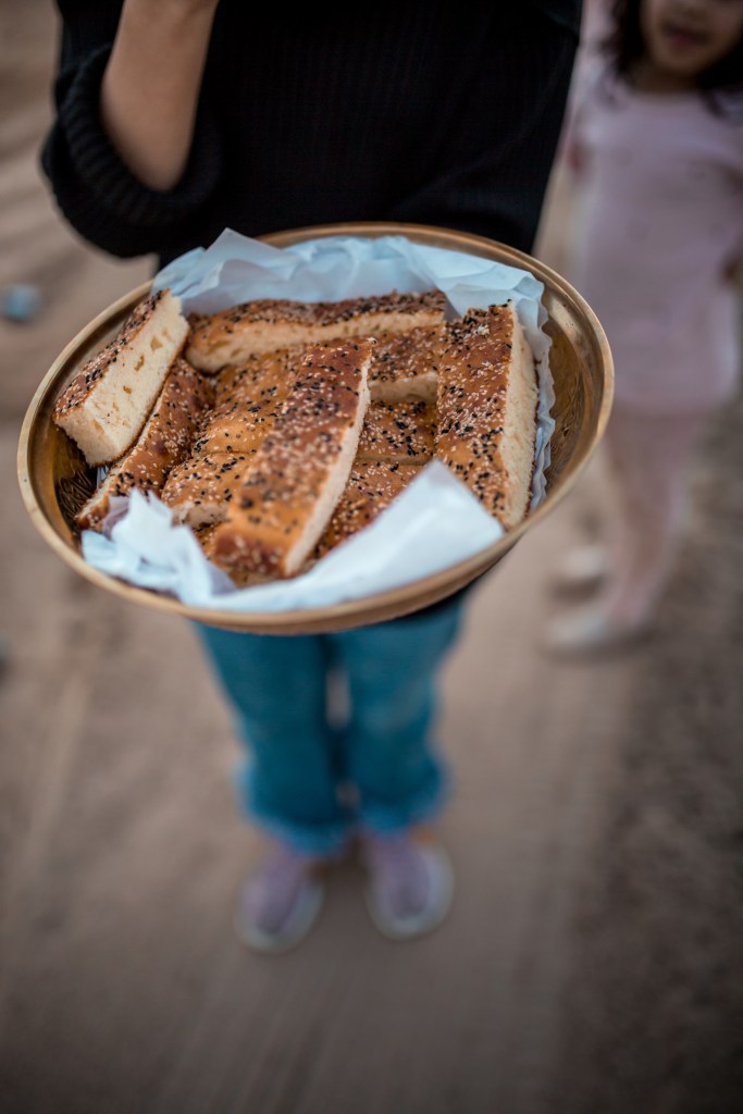 Traditionell sitzen die Frauen mit den Frauen und die Männer mit den Männern. Während also die Jungs mit dem Vater der Familie, den Söhnen und angeheirateten Männern der Töchter unterhalten und auf Plastikstühlen die Aussicht genießen, finde ich mich zwischen den Frauen in traditionellen Gewändern auf einer Decke am Lagerfeuer wieder. Die Gastfreundschaft ist unglaublich und neben den unterschiedlichsten selbstgemachten Speisen gibt es Datteln, Nüsse und noch mehr Leckereien.
