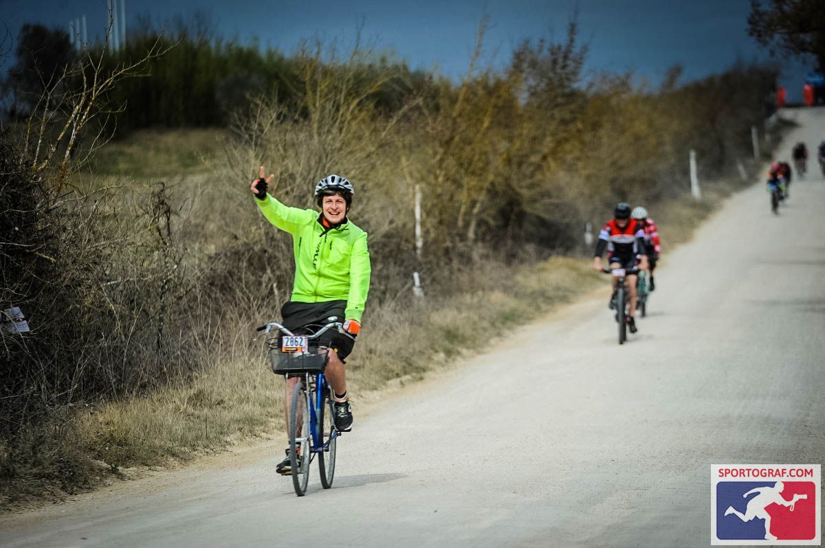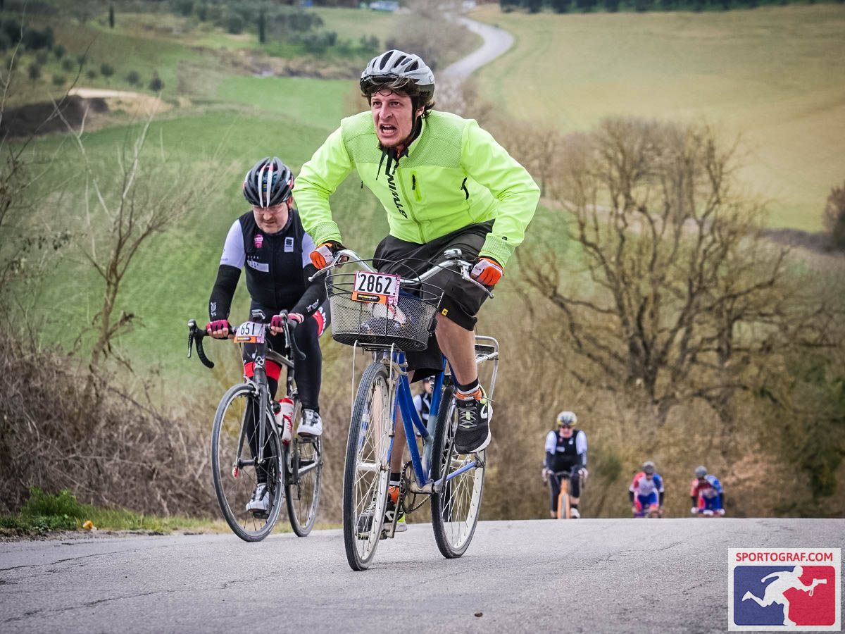 Gioia o forse ammirazione per colui che ha deciso di intraprendere una gara in sella alla sua olandesina blu, in un percorso di quasi 90km, con pendenze oltre il 16% e oltre 20km di sterrato. L’olandesina non è una bici comune, perché è senza marce. Lo incito con naturalezza, come farebbe un tifoso con la sua squadra del cuore.