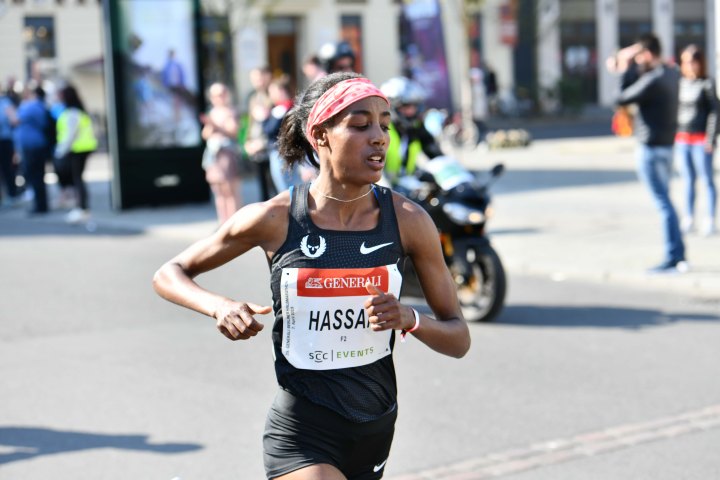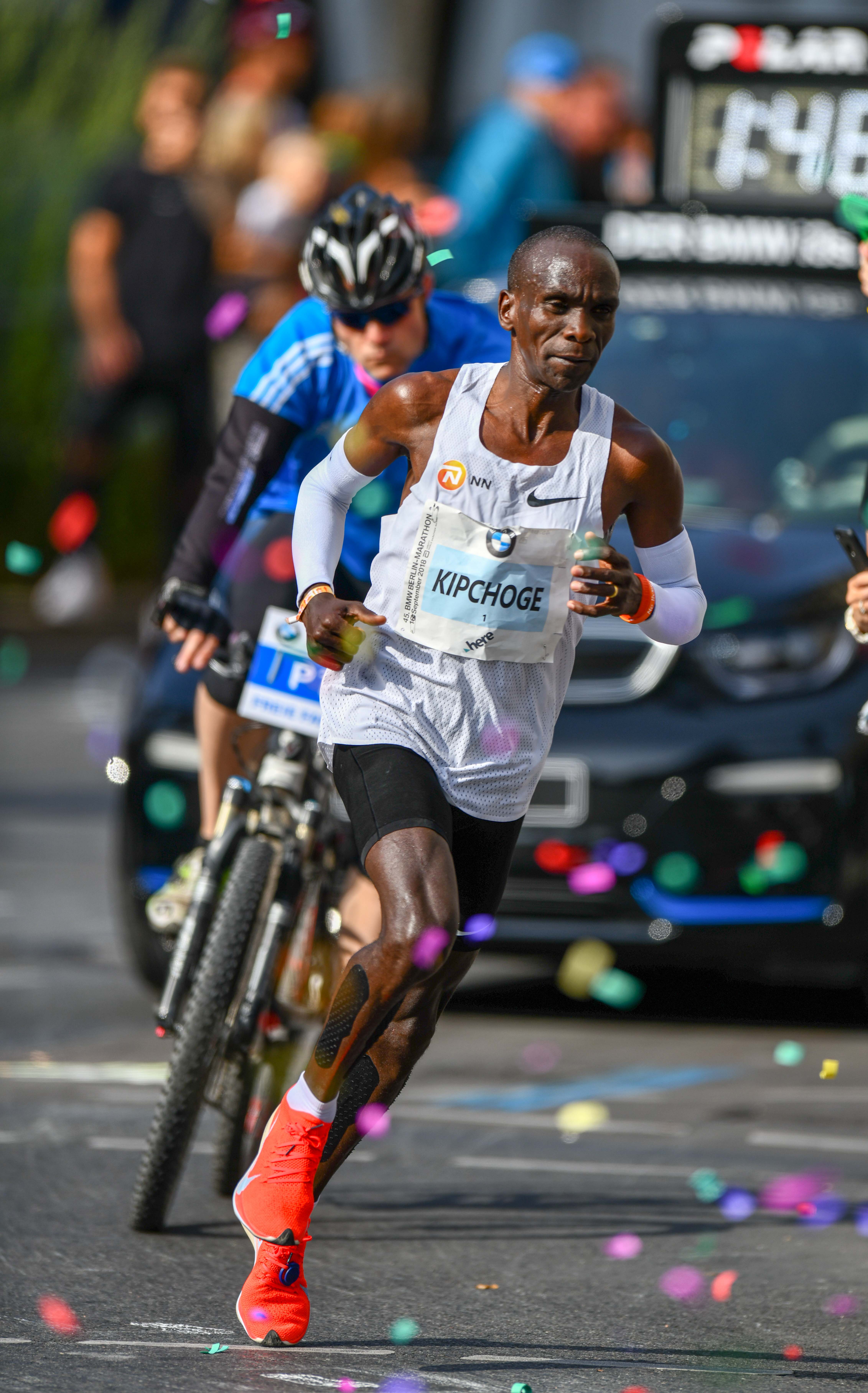 Ziemlich schnell kommen die Spitzenläuferinnen in Sicht, dann finden sich zunehmend Startnummern anstatt aufgedruckter Namen. Bald wird das Feld der Läufer dichter und es wird schwieriger, Einzelne zu fixieren. Also weniger Tele, mehr Totale. Es folgen über 37.000 Läufer, deren Gesichter und Laufstile über die Fotos eine eigene Geschichte des Laufes schreiben. Das macht den Reiz der Fotos aus.