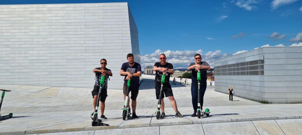 Sonntag konnten wir Oslo erkunden, da unser Flug erst abends ging. Vor dem Frühstück machte ich einen kleinen Fotowalk durch Oslo, um mir vor allem ein Viertel namens „Barcode“ anzugucken. Die Architektur hier war der absolute Hammer! Allgemein ist die Innenstadt von Oslo sehr modern gebaut, doch jedes Gebäude wirkt komplett anders, als hätte es doch seine ganz eigene Geschichte. Jedes Haus hatte einen Charakter, auch wenn es quasi nur stupide Innenstadtwohnung war. Nach dem nach norwegischen Standard teuren Frühstück leihen wir uns als gesamte Runde einen E-Roller für nur 3,50€ am Tag aus. Durch die vielen E-Roller und E-Autos ist die Innenstadt von Oslo unvergleichbar leise. Weswegen die ganze Stadt sehr erholt wirkt. Bei blendendem Wetter düsen wir mit unseren Rollern vom Hotel zur Oper. Die ist direkt am Wasser und obwohl wir weder Handtücher noch Badesachen mithaben entscheiden einige von uns, ins Wasser zu springen. Die anderen warten währenddessen (Langweiler!). Danach geht es am Wasser entlang. Irgendwo auf dem Weg machen wir Stopp, um ein kleines Video von unserer Roller-Gang zu drehen. Dann geht die Fahrt auch schon weiter. Das Ziel des Roller-Roadtrips ist „Aker Brygge“, Oslos Hafenpromenade. Auch dort mussten wir noch einmal ins Wasser springen…